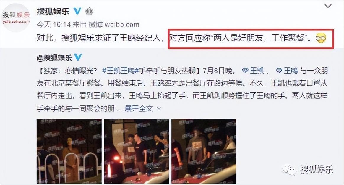 不过,被拍到牵手后,王鸥经纪人对媒体明确表示“两人只是好朋友,且是工作聚餐”。王凯方面也称:“只是好朋友,《猎狐》剧组同事一起定妆之后的聚餐而已。”